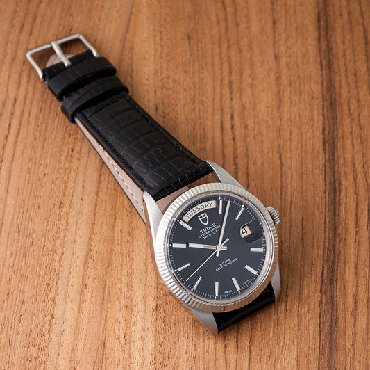 Tudor, Oyster Prince, Date+Day, Ref. 7020/0, 7019/4, ca. 1969 Automatik, seltenes schwarzes Zifferblatt, Edelstahl und 18 Karat Weissgoldlünette
