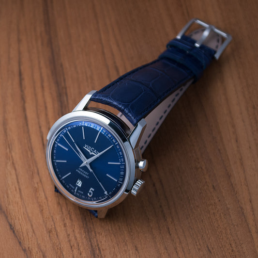 Vulcain Cricket 50s Presidents, blaues Zifferblatt, 42 mm Edelstahl, Handaufzug, Weckerfunktion, Datum