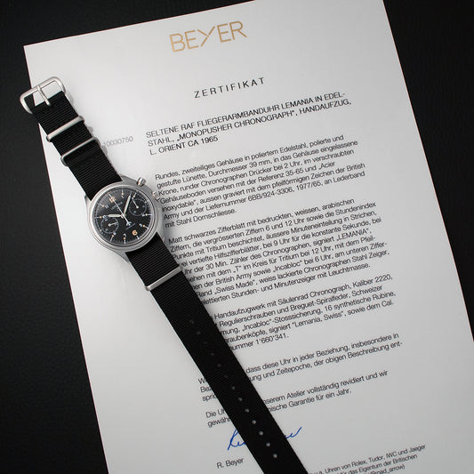 Lemania, Fliegerchronograph, «Monopusher», RAF, 1965, Edelstahl, Handaufzug, Kaliber 2220, mit Zertifikat von Beyer, Zürich