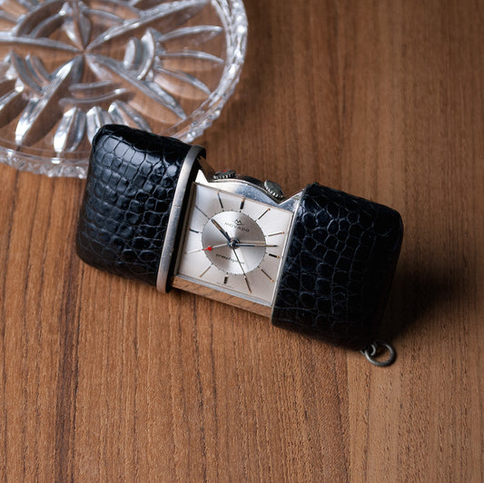 Movado Ermetophon, Reisewecker, Edelstahl mit schwarzem Leder