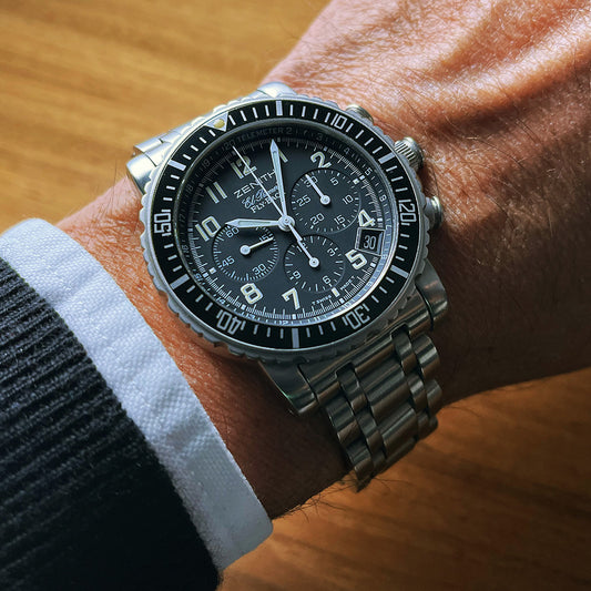 Zenith Chronograph, Kaliber 146 DP Edelstahl, verschraubtes Gehäuse, Tritium-Zifferblatt
