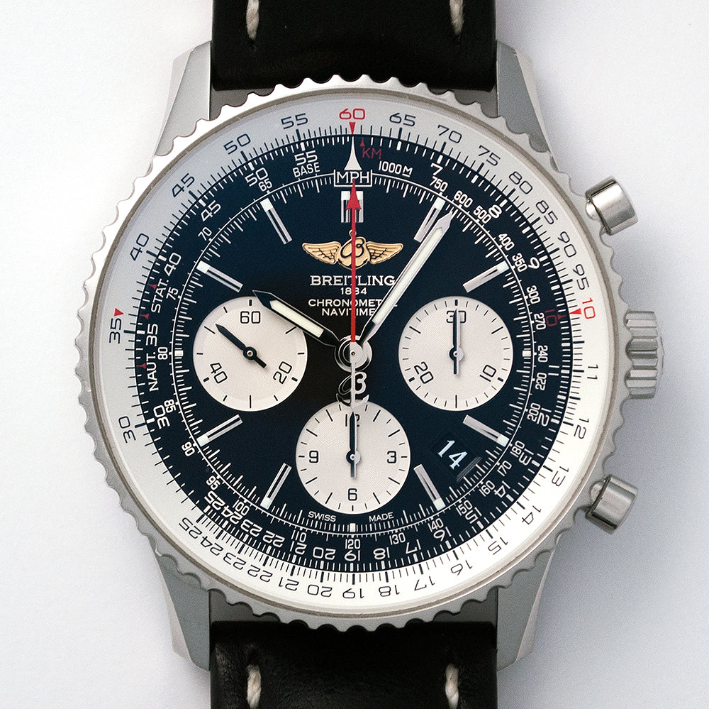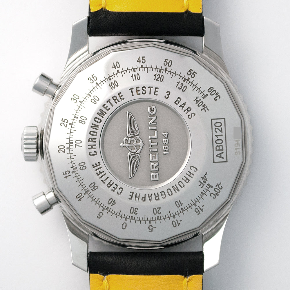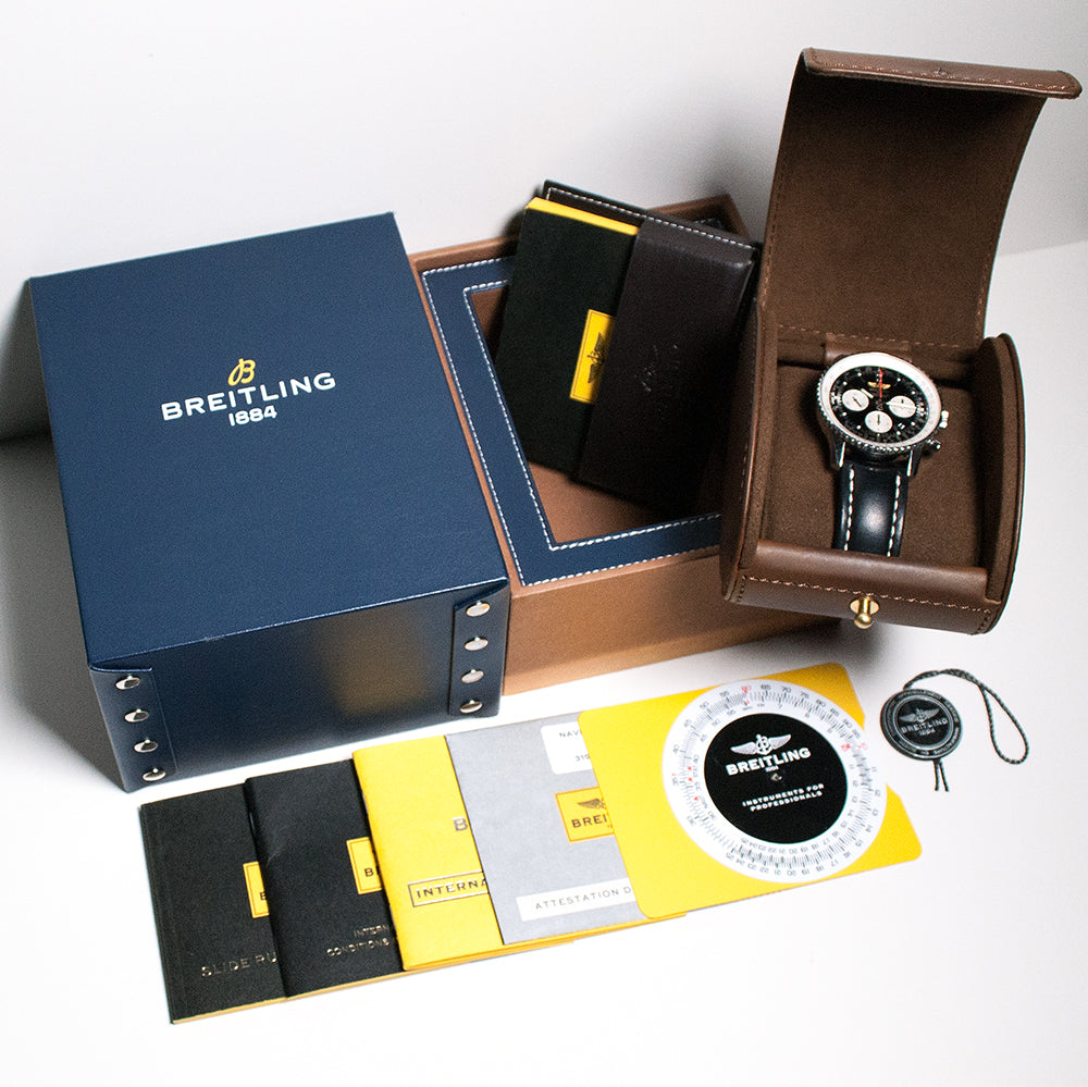 Zifferblatt: Schwarzes Zifferblatt mit Indizes und Leuchtzeiger, Rechenschieber, Umrechnung km/Meilen/Seemeilen, Breitling-Logo, signiert mit «BREITLING, 1884, CHRONOMETRE, NAVITIMER, SWISS MADE», Hilfszifferblatt für die kleine Sekunde bei 9, 30-Minuten- und 12-Stundenzähler, zentraler roter Sekundenstoppzeiger, Datum bei 4.30 Uhr