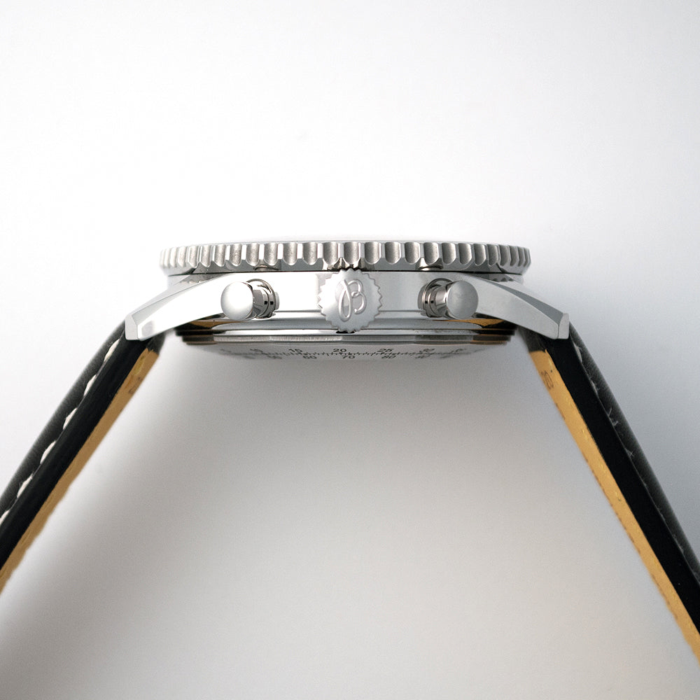Gehäuse: Wasserdichtes Edelstahlgehäuse mit zwei Additionsstoppern, drehbare Lünette, verschraubter Boden mit Breitling-Logo sowie Gravur «BREITLING 1884» und «CHRONOGRAPHE CERTIFIE CHRONOMETRE, TESTE 3 BARS», Seriennummer 3'194'XXX, Saphirglas, Breitlingkrone, neues schwarzes Breitling-Lederband mit Breitlingfaltsschliesse