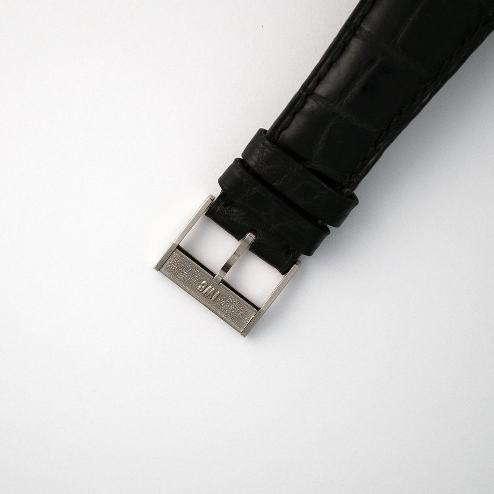Gehäuse: Poliertes und satiniertes Stahlgehäuse mit verschraubtem Boden, innen signiert mit «INTERNATIONAL WATCH Co SWISS», IWC-Logo «PROBUS SCAFUSIA», Saphirglas, IWC-Originalkrone, Gehäusenummer 2'197’248, Lederband mit IWC-Dornschliesse