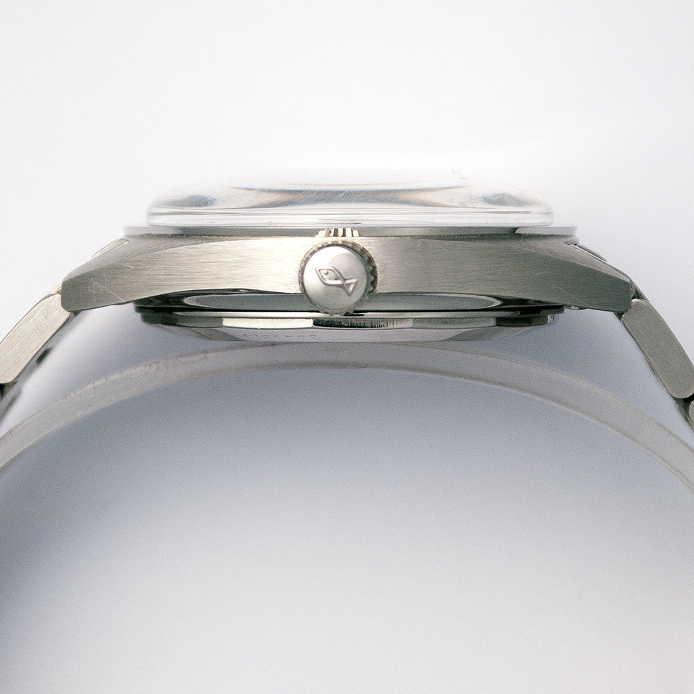 Albert Pellaton, technischer Direktor IWC 1944 bis 1966, entwickelte 1950 wohl eines der genialsten automatischen Aufzugssysteme, welches erstmals im Kaliber 85 zum Einsatz kam. Der Mechanismus der Uhr zog nicht – wie damals üblich – durch eine einseitige Drehung, sondern durch die beidseitige Bewegung des Rotors auf. Diese schöne IWC Yacht Club ist auch mit diesem Exzenter-Aufzug ausgerüstet.